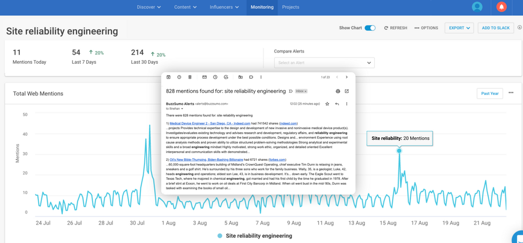 Andy at Pepperdata has tackled this problem by setting up a BuzzSumo alert around the niche topic of “Site reliability engineering”.