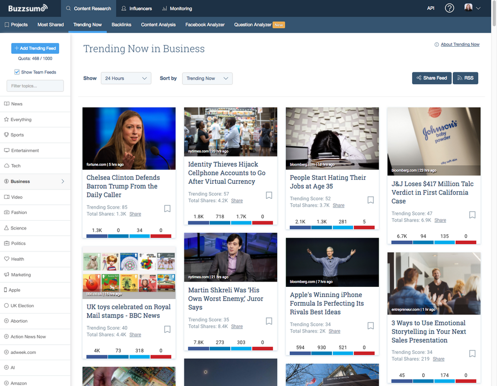Mike uses saved searches and the Trending section of BuzzSumo each morning to find content to share.