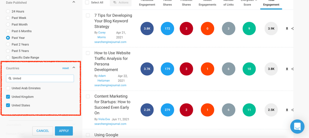 When you search a keyword or phrase in the Content Analyzer, it will return a list of the top headlines by engagement.
