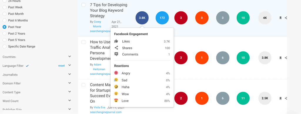 This tool helps you understand the types of articles that are linking to content, and gives you a breakdown of their engagement, so that you can outreach to authors that have the power to push your content furthest.