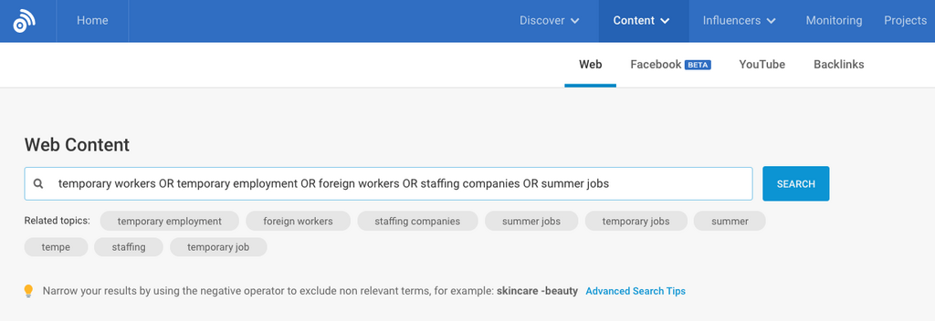 One of our customers in the HR space was looking to discover content surrounding “temporary workers”, but it's a niche field and it taps into lots of different search phrases (temp workers, staffing agencies, etc.)