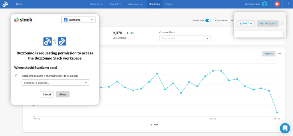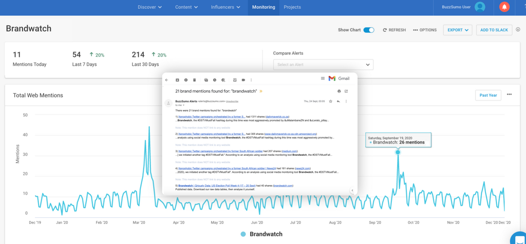 At BuzzSumo, we allow users to integrate with Slack and set up crisis management alert channels.