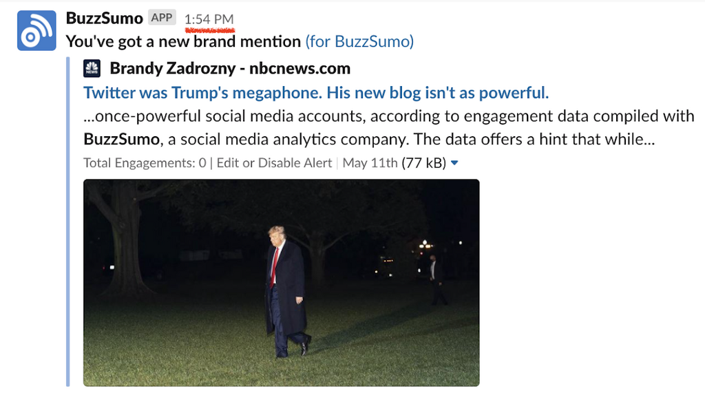 Thanks to BuzzSumo’s super speedy monitoring and alerts (which outpace even Google Alerts for PR monitoring) our team spotted this mention the same day, via our real-time “BuzzSumo-Mentions” channel in Slack.