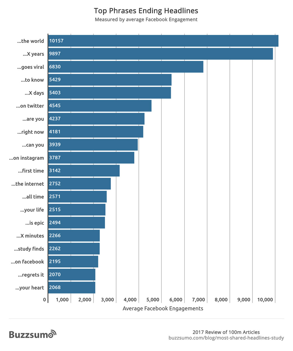 Below are the most popular phrases that end headlines by number of Facebook interactions (x represents a number).
