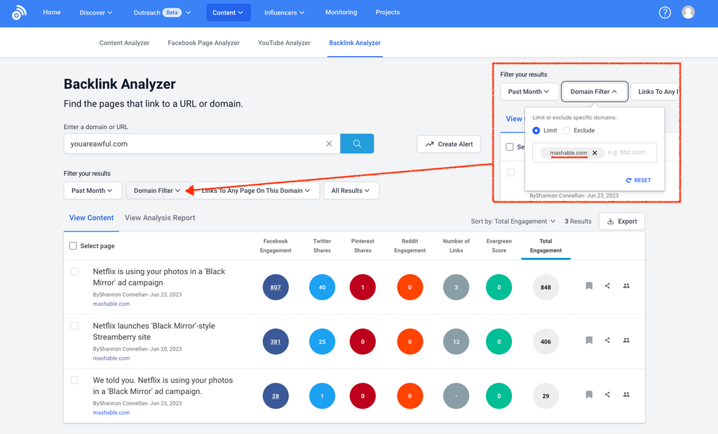 Or, search your brand or clients’ domain in the Content Analyzer, and benchmark your PR against the rest of the sites’ average engagement.