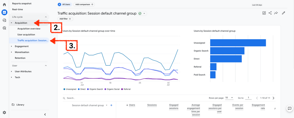 Go to Acquisition → Traffic Acquisition: Session default channel group.