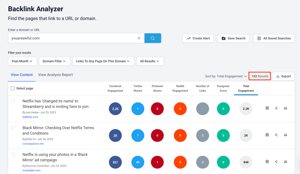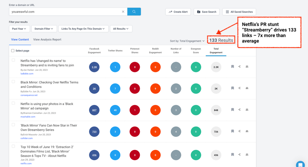 For example, according to our Content Analysis Report tab, Netflix drives 20 links on average per piece of content.