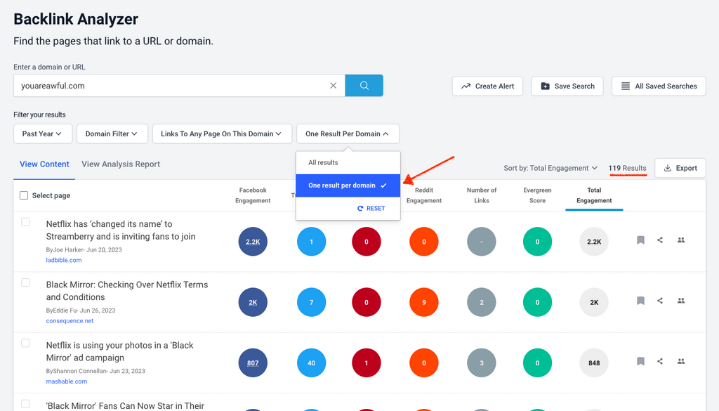 Or “One result per domain” to see only the most engaging links from unique referring domains.