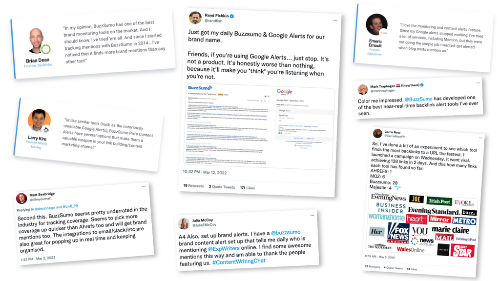 BuzzSumo Monitoring & Alerts are more comprehensive than Google Alerts, and, according to our customers, more streamlined than Meltwater or Vuelio.