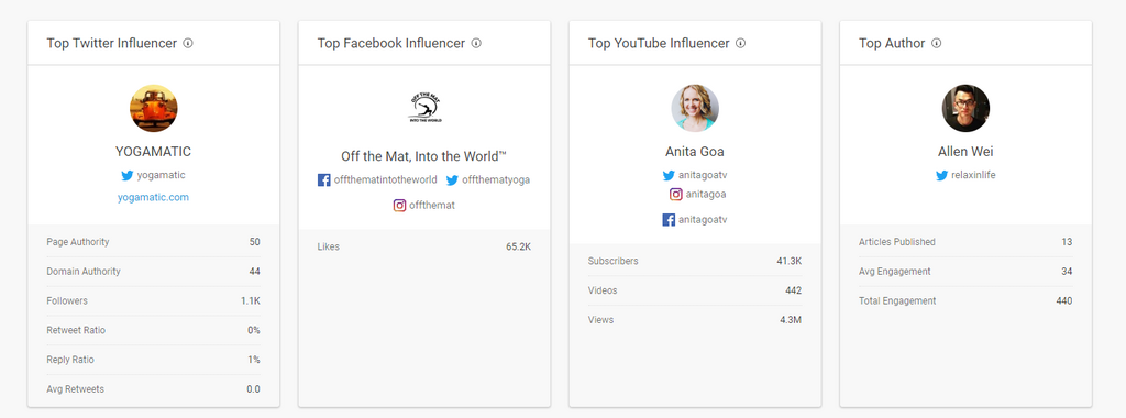 After running the “yoga mat” keyword search, you can click over to the Analysis tab for a deeper look at the content. Scroll to the bottom and you’ll see a list of top influencers to follow.