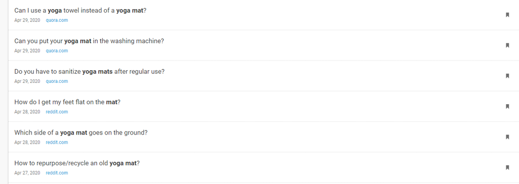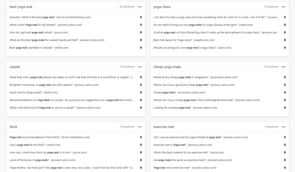 By running the keyword “yoga mat” through the BuzzSumo Question Analyzer, you get tons of potential topic ideas aggregated from forums across the internet: