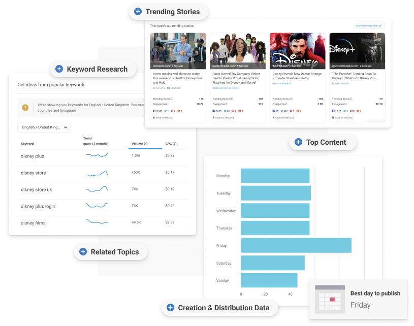 Combine keywords with BuzzSumo’s content, questions and influencer data to create comprehensive content.