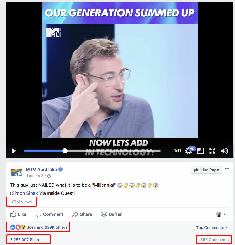 This Facebook video posted by MTV Australia focused on the millennial generation. It was viewed over 100m times, it was shared more than 2m times and attracted over 80,000 comments. In many ways this could be argued to be the top Facebook post relative to the size of its own page audience, 770,000 people have liked MTV Australia’s page but this video gained over 2m shares and 100m views.