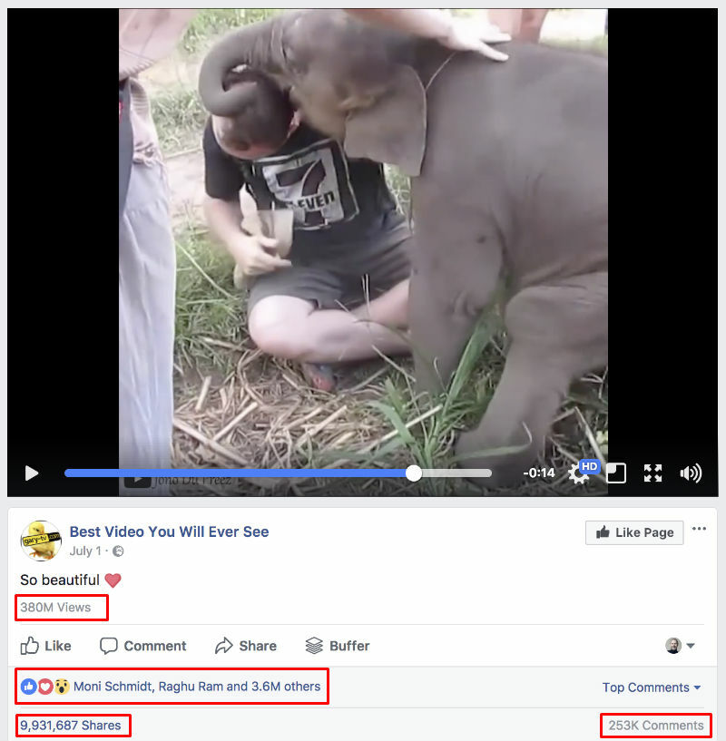 This Facebook video posted by GaryTV is a compilation of animals and people being affectionate to one another. It had over 380m views, it was shared almost 10m times, received 3.6m likes and reactions and attracted over 250,000 comments. In terms of engagement relative to Facebook page likes, this post did better than Blossom and Bright Side, as it gained more engagements than the 6.5m people that have liked the GaryTV page.
