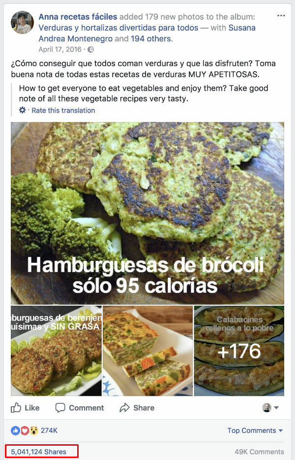 The top non-video post was this set of food recipes, it was also the top Facebook post in Spanish this year with over 5m shares. This post also did well relative to the 3.9m people that have liked Anna’s Facebook page.