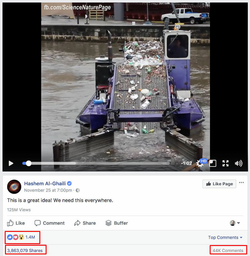 People love to share inspiring new technology and ideas. This video post of a boat removing plastic and flotsam from water was shared over 3.8m times and had over 1.4m likes and reactions.
