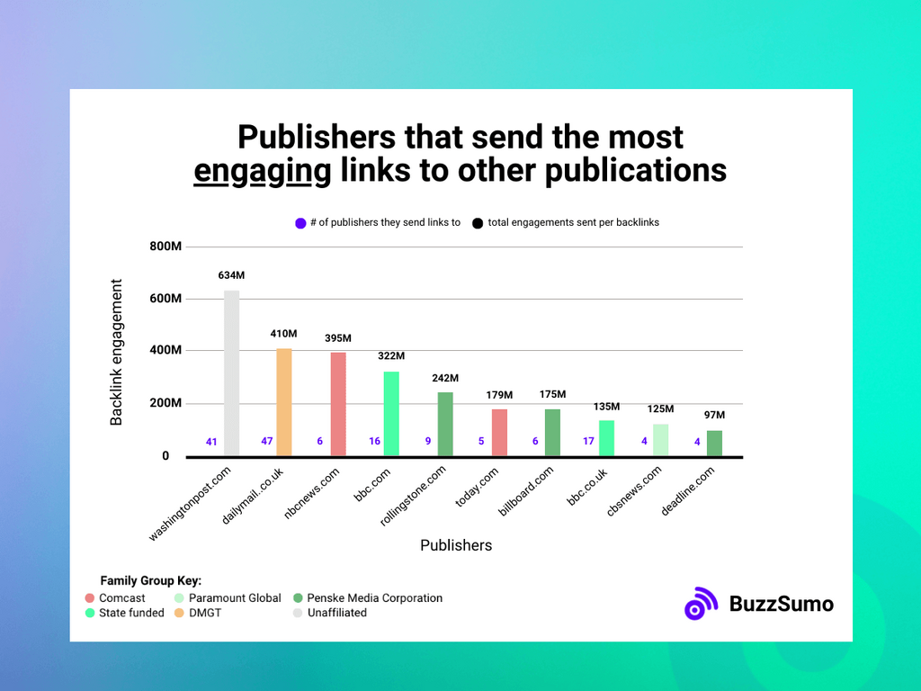 Hot on its heels with 670M backlink engagements is Penske Media Corporation, which consists of entertainment and lifestyle publications Variety and Billboard.